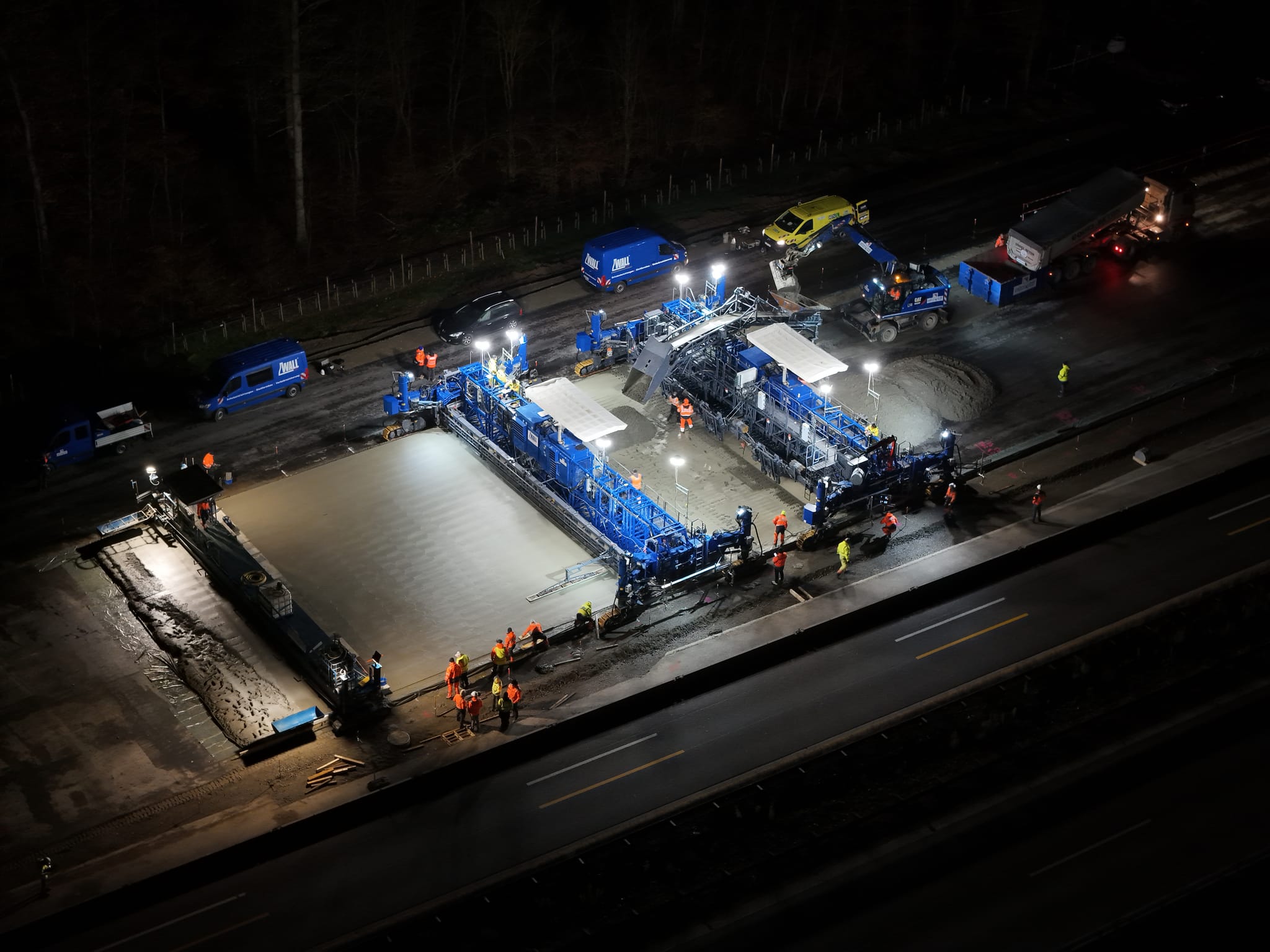 Ein Betonfertiger im Einsatz, der sich von Osten nach Westen vorarbeitet. Der Beton wird in zwei Lagen aufgebracht, verteilt, verdichtet und geglättet.