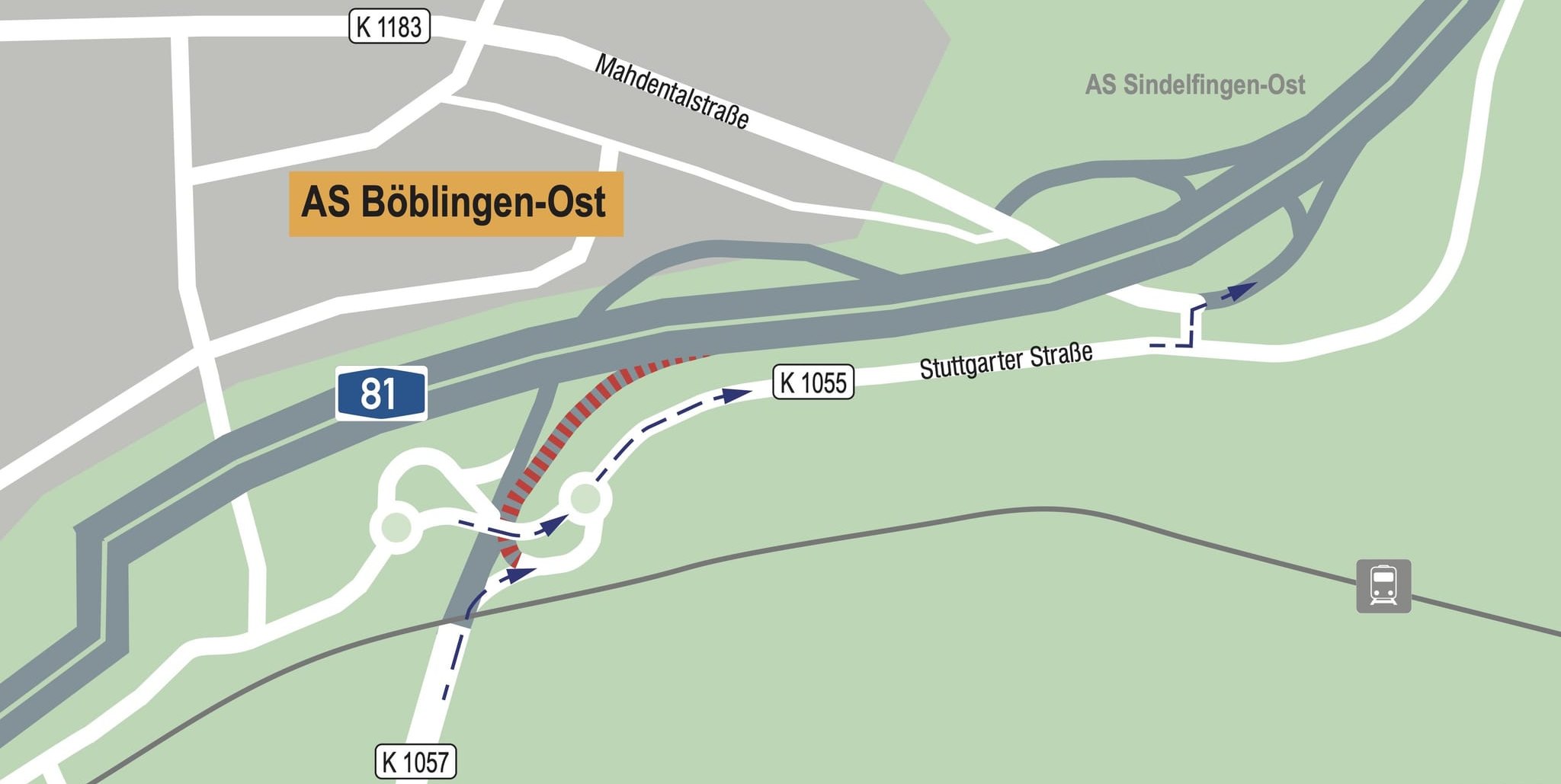 Böblingen. Die Auffahrt in Fahrtrichtung Stuttgart wird im Bereich der Anschlussstelle Böblingen-Ost vier Wochen lang voll gesperrt: von Sonntag, 4. August, 22 Uhr, bis voraussichtlich Samstag, 31. August, 6 Uhr, müssen Autofahrer eine Umleitung über die K 1055 und die Anschlussstelle Sindelfingen-Ost fahren (siehe Grafik).