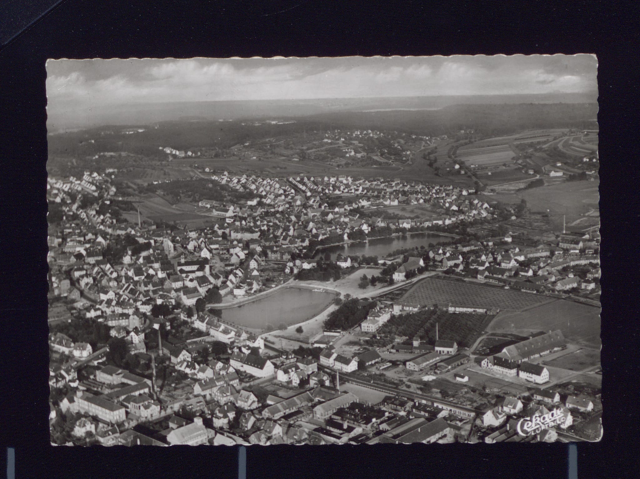Blick von Westen auf die Stadt bis zum Schönbuch mit Industriegebiet zwischen Bahnhofstraße und Herrenberger Straße im Vordergrund; Südseite Seeufer Unterer See noch nicht angelegt.