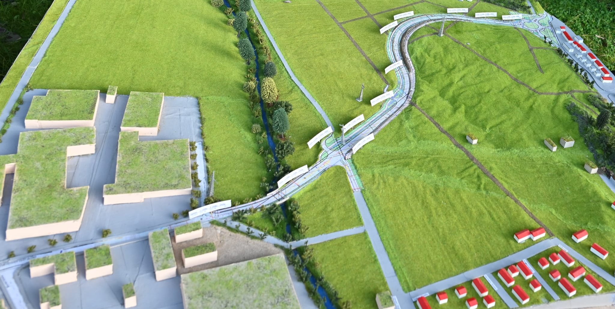 Die Osttangente im Modell. Sie überquert aus dem Gewerbegebiet Ost (links unten) kommend (Hutwiesenstraße) auf einem Damm den Planbach im Hölzertal, führt in einer Schleife um den Gollenberg herum und mündet an einem Kreisverkehr (rechts oben), von dem aus auch die Zufahrt zum Sportgelände an den Buchen abgeht, in die Alte Stuttgarter Straße. Auf dieser geht es weiter zum Aspenschopf in Richtung Stuttgart und Sindelfingen oder auf die Südtangente in Richtung B 464. Die Häuserzeile am rechten Bildrand gehört zum innerörtlichen Teil der Alten Stuttgarter Straße. Bild: Reichert