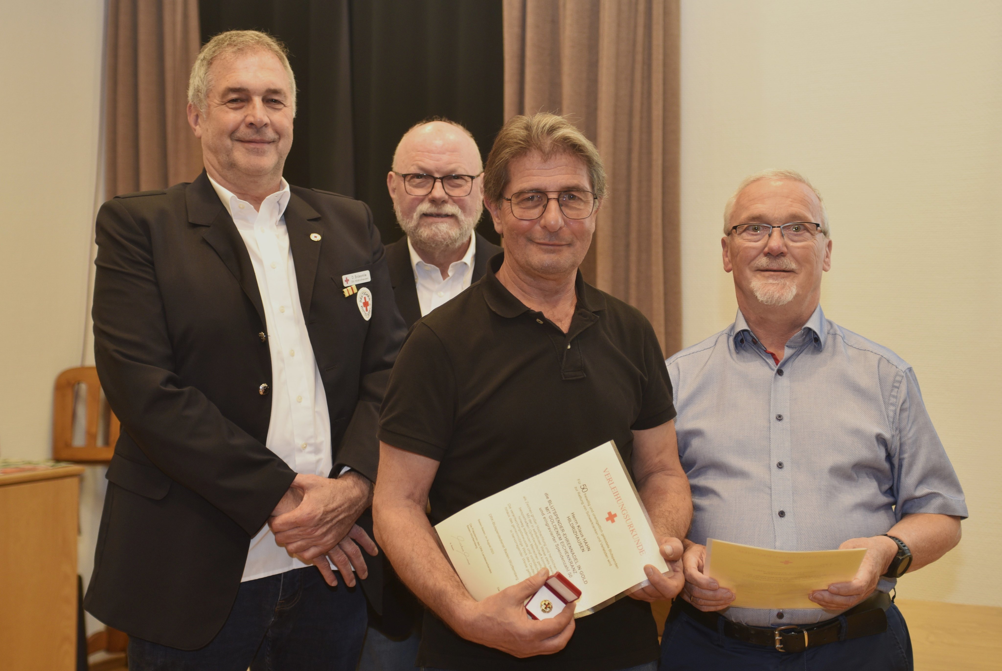 Blutspenderehrung in der Jahreshauptversammlung des DRK Hildrizhausen. Der Vorsitzende Dietmar Brösamle (von links) und Sozialarbeitsleiter Günter Hörmann zeichneten Klaus Hahn für 50 und Hans.Joachim Volz für 175 Spenden aus.