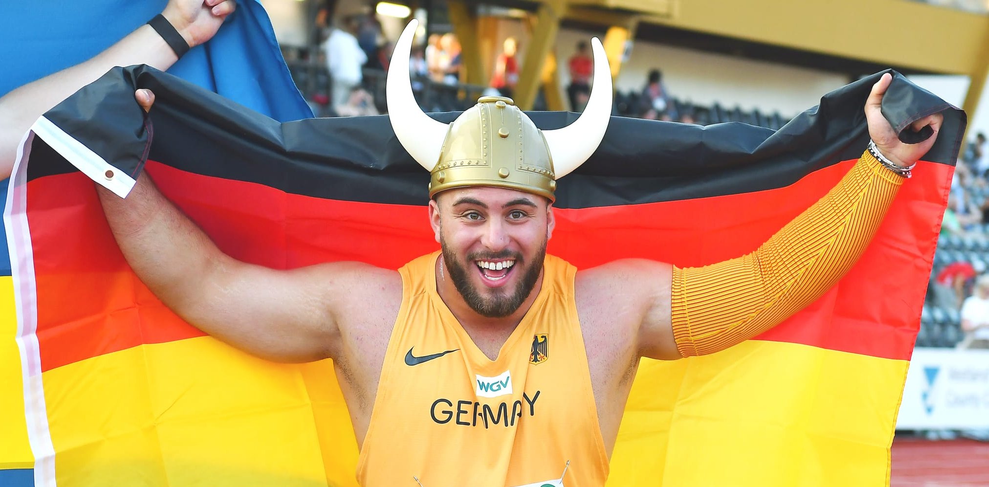 Der Sindelfinger Kugelstoßer Tizian Lauria feiert seinen EM-Triumh im norwegischen Bergen standesgemäß. Bild: Iris Hensel