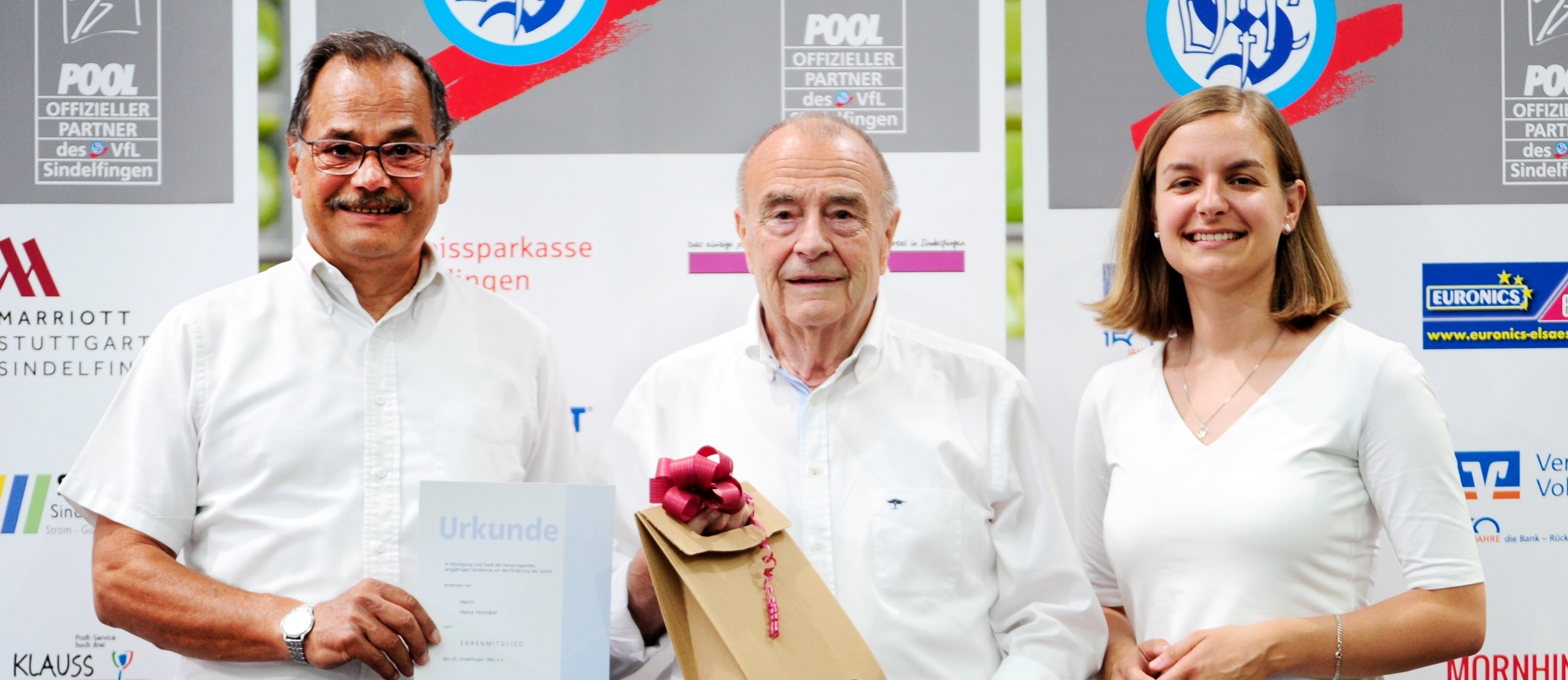 Präsident Dr. Heinrich Reidelbach und Geschäftsführerin Anne Köhler nehmen das neue Ehrenmitglied Heinz Hornikel in die Mitte. Bild: Photostampe