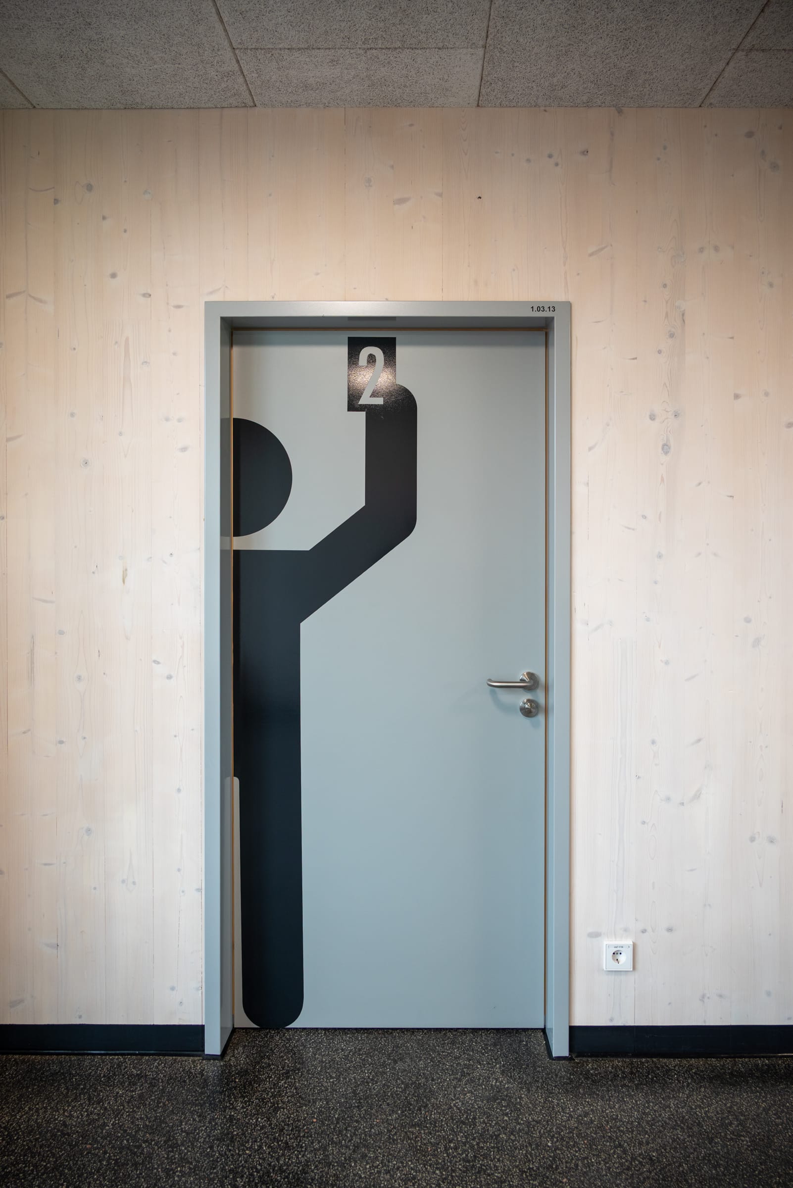 Großformatige Piktogramme zeigen geben den Nutzern ihrejeweiligen Räume. Dazu gehören drei Schiedsrichterkabinen wie diese, ausgestattet mit Tisch, Stuhl und sanitären Anlagen.