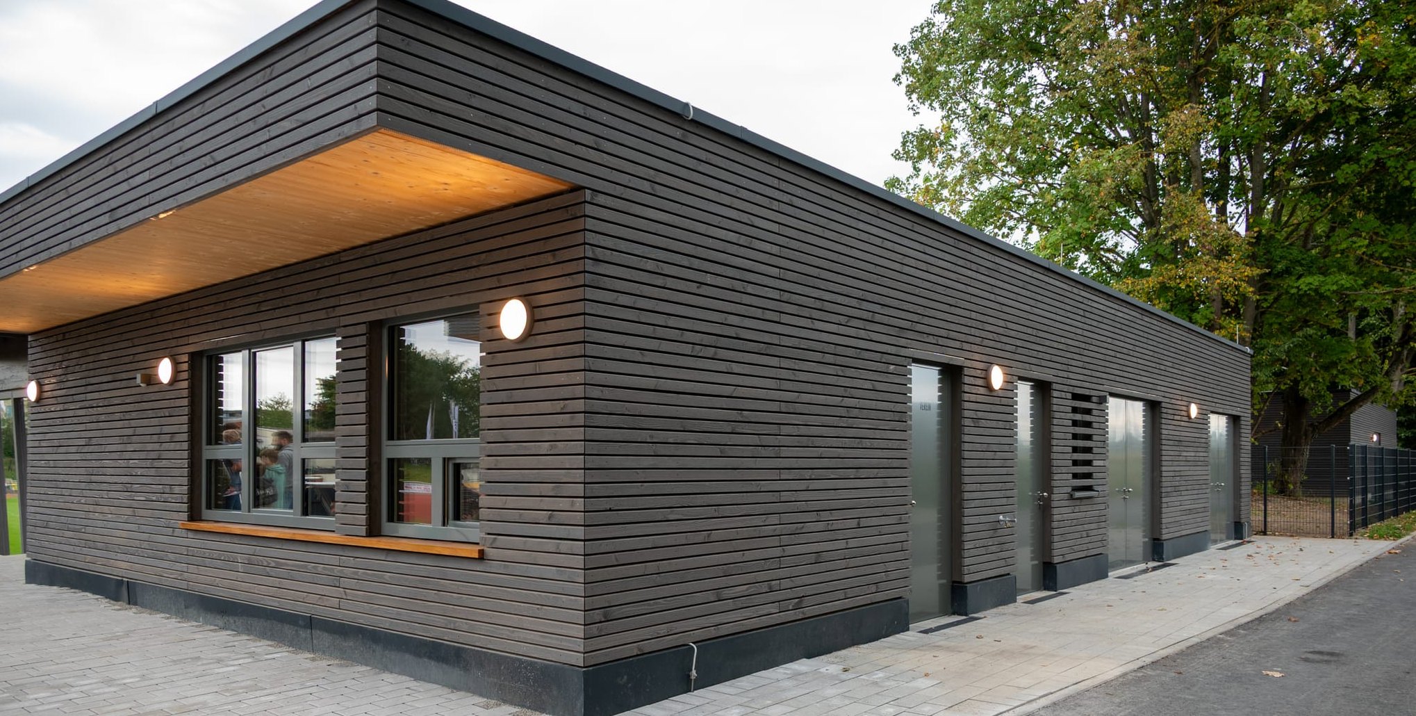 Bodentiefe Fenster im Funktionsgebäude bieten freie Sicht auf das Stadion.