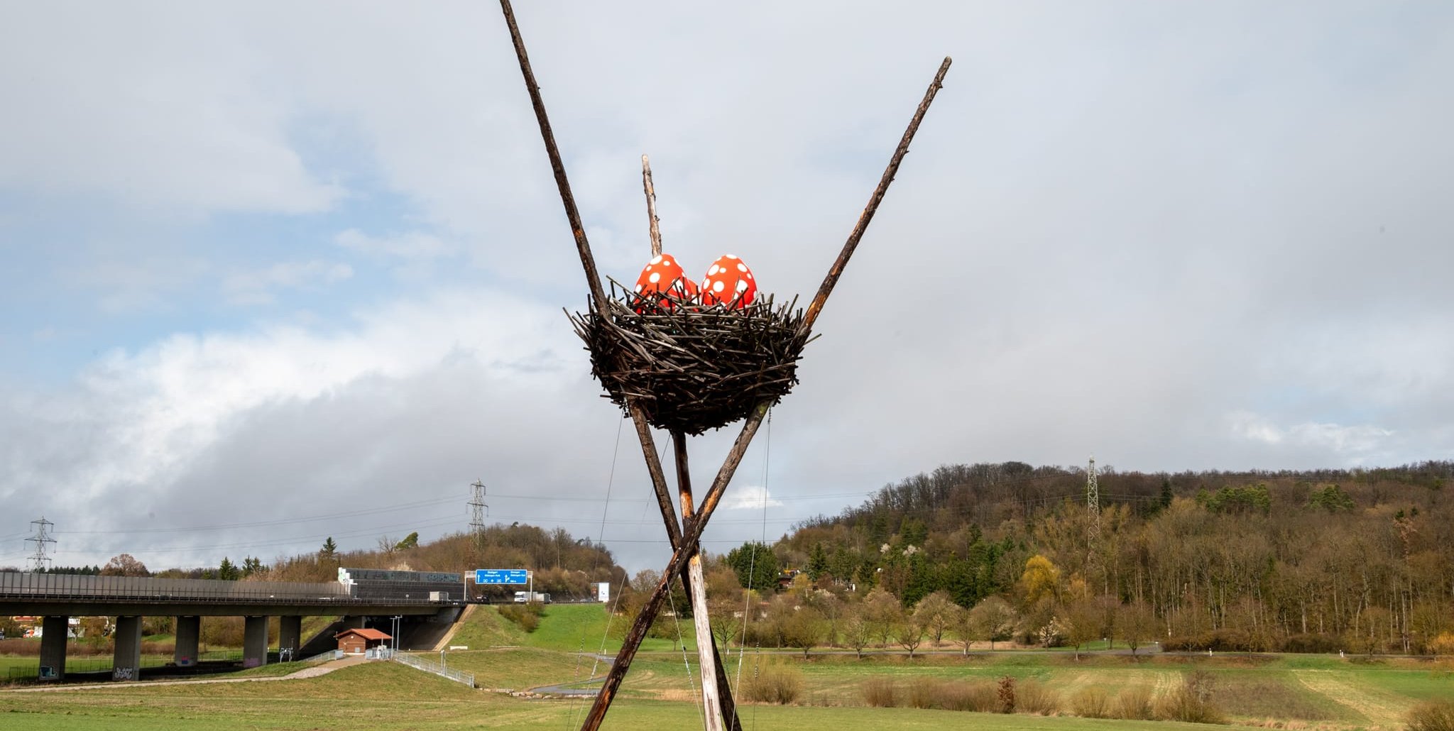 Zur Gestaltung verwendete Schweikle Hartschaum, Putz und Farbe. „Wir haben die verspiegelten Eier zunächst ‚geschält‘ und dann neu verputzt und bemalt“, sagt er. „Mir fiel bei den diesjährigen Planungen ein, dass am alten Vogelnest immer ganz viele Marienkäfer im Holz lebten, und deren Punkte waren Anlass, die Eier dieses Jahr gepunktet zu gestalten.“ Damit will Mathias Schweikle, der „Vater des Nests“, den Neubeginn und die Lebensfreude symbolisieren.