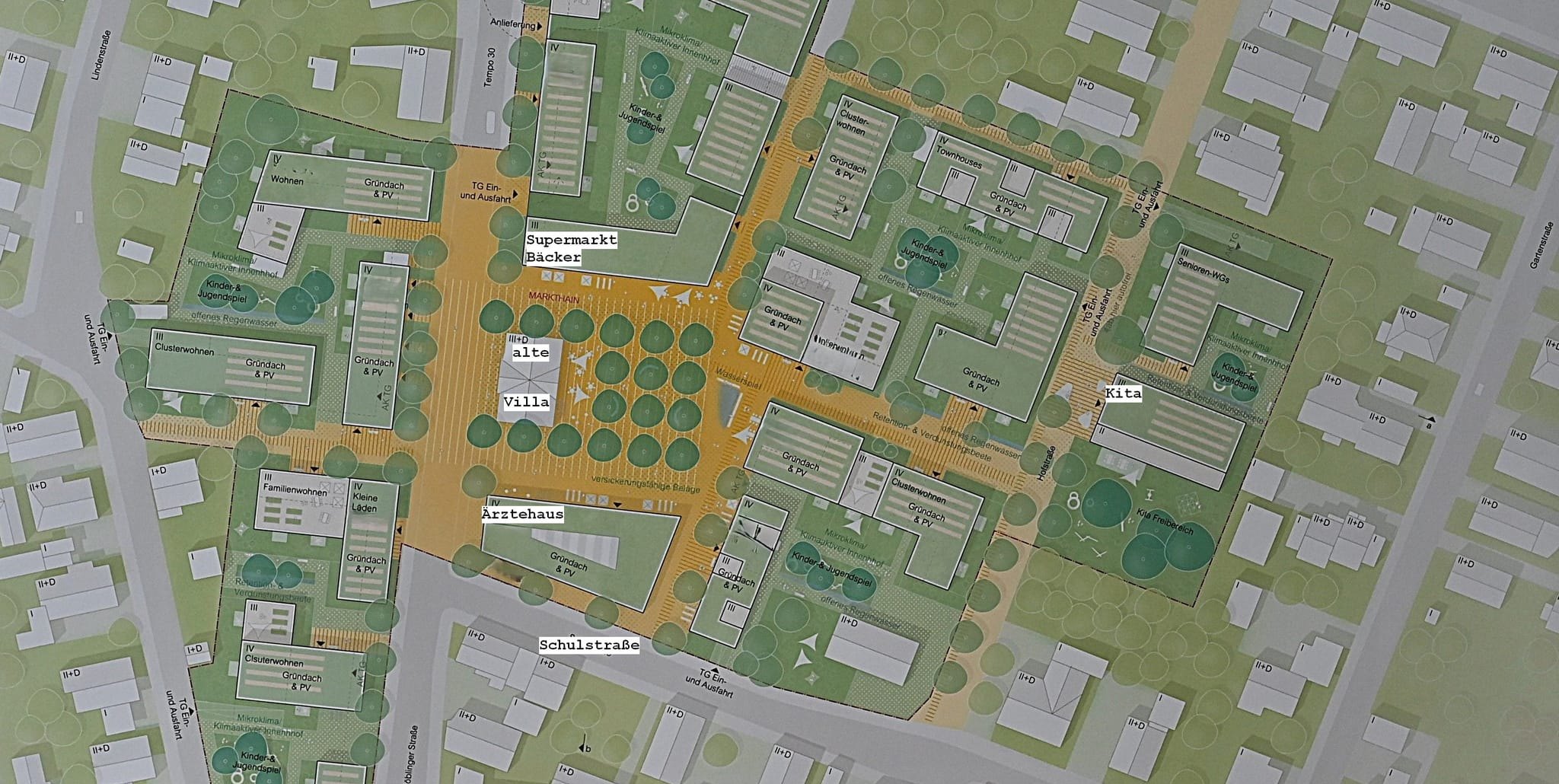 In der Mitte der Grafik sieht man die Alte Villa und den frei werdenden Platz in der Mitte Schönaichs. Bild: Reichert