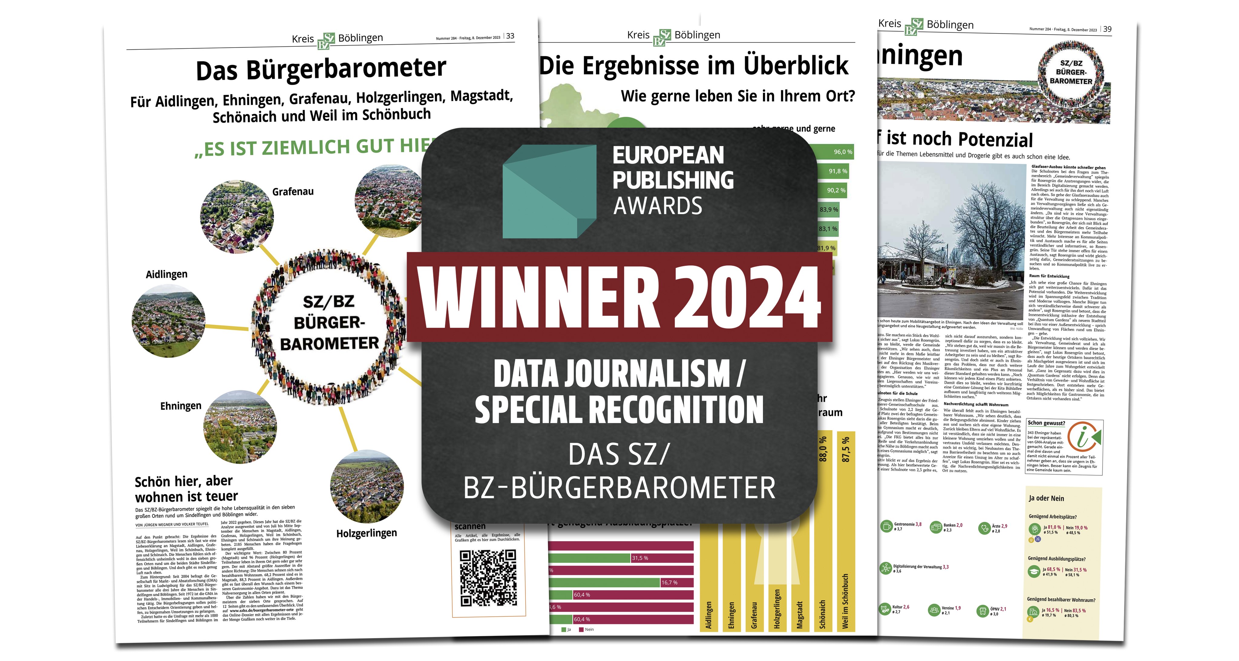 Sindelfingen/Wien. Da dürfen schon mal die Sektkorken knallen: Mit dem SZ/BZ-Bürgerbarometer ist die Redaktion bei den European Publishing Awards in der Kategorie Datenjournalismus mit einer „Judges Special Recognition“, also einer besonderen Anerkennung der Jury, ausgezeichnet worden. Zu den Preisträgern in anderen Kategorien gehören renommierte überregionale Medien wir das Nachrichtenmagazin „Der Spiegel“, die „Wirtschaftswoche“ oder die Recherche-Plattform „Correctiv“.