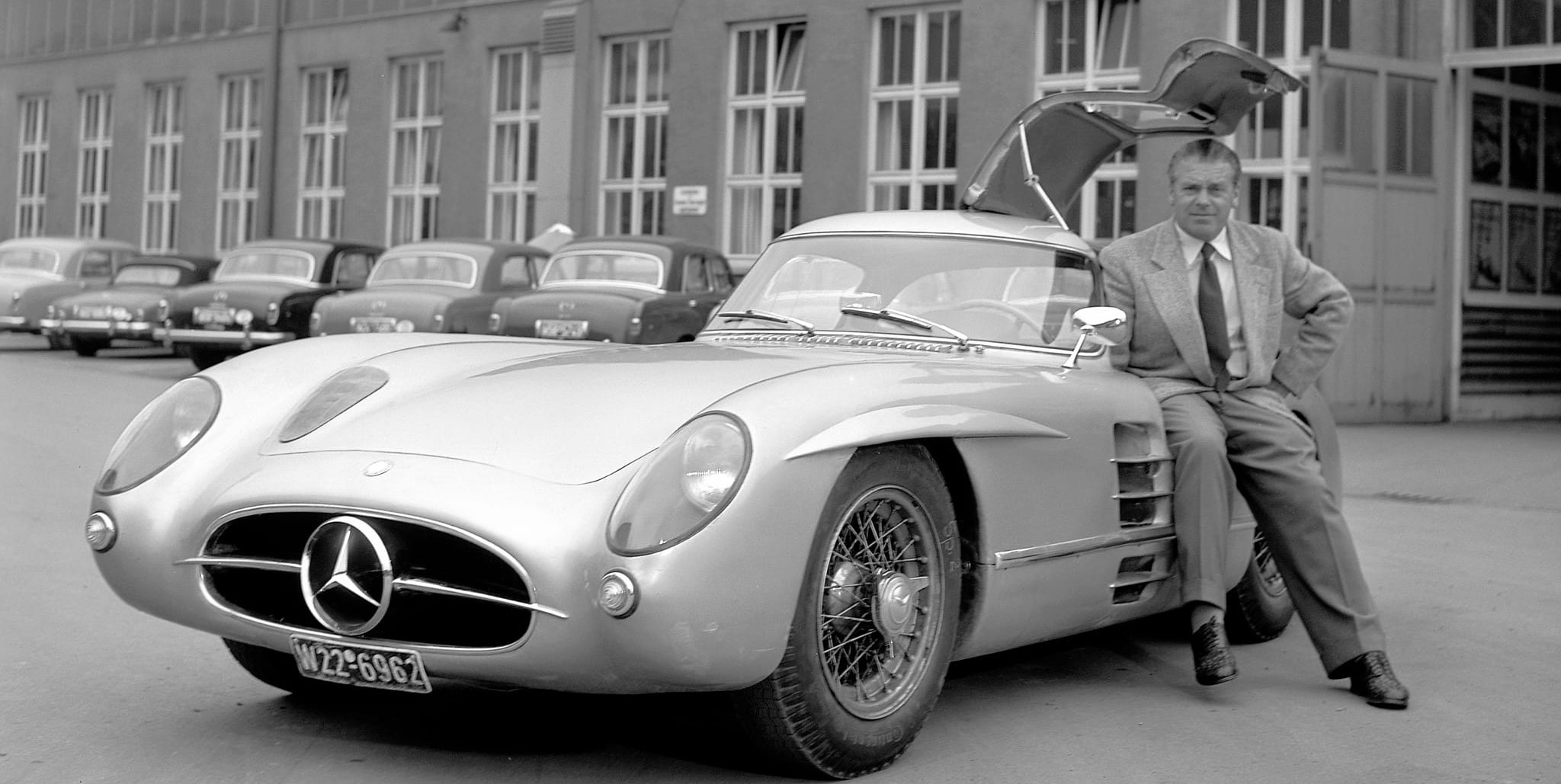 Eines der beiden 300 SLR Uhlenhaut-Coupés zusammen mit Namensgeber Rudolf Uhlenhaut. Dieses Fahrzeug ist im Mercedes-Benz Museum ausgestellt.