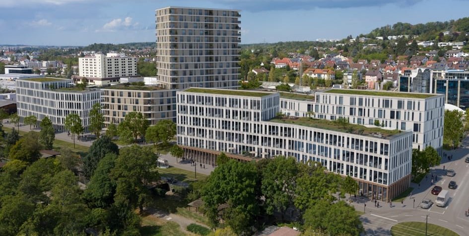Aus einem Workshopverfahren in Abstimmung mit der Stadt Sindelfingen ist der Siegerentwurf des Düsseldorfer Büros RKW+ Architektur hervorgegangen. Das neue Gebäudeensemble formiert sich um eine attraktive Quartiersmitte. Der mit viel Grün und Wasser gestaltete Platz bietet Raum für Außengastronomie und bildet das soziale Herz des neuen Quartiers.