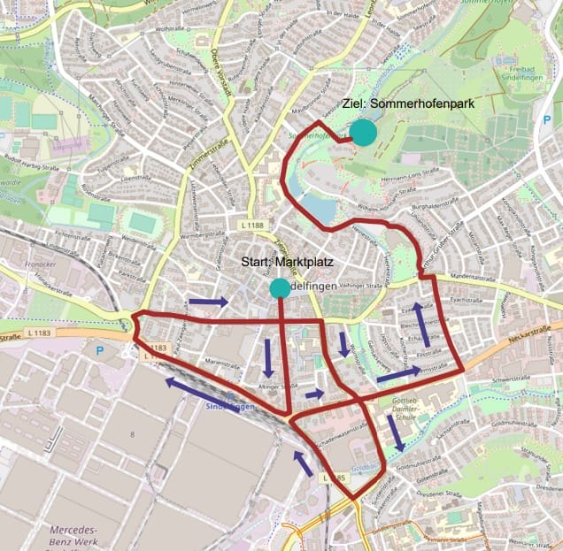 Die Rad-Demonstration startet um 15 Uhr mit einer Kundgebung am Sindelfinger Marktplatz. Der Umzug läuft ab 15.20 Uhr vom Marktplatz Sindelfingen über die Bahnhofstraße, Hanns-Martin-Schleyer Straße, Calwer Straße, Gartenstraße, Böblinger Straße, Neckarstraße, Lange Anwanden, Schillerstraße, Burghaldenstraße, Seestraße zum Sommerhofenpark Sindelfingen. Der Umzug endet dort um 16 Uhr.