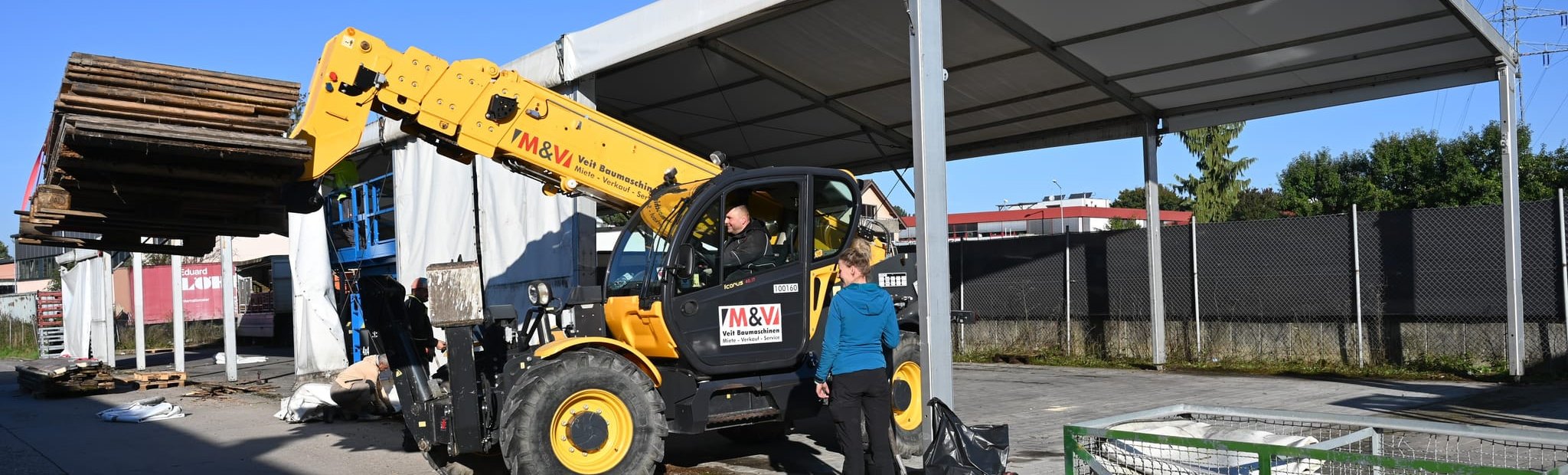 Vor dem Abbau des Zeltes werden Reste des Lagers mit dem Stapler abtransportiert.