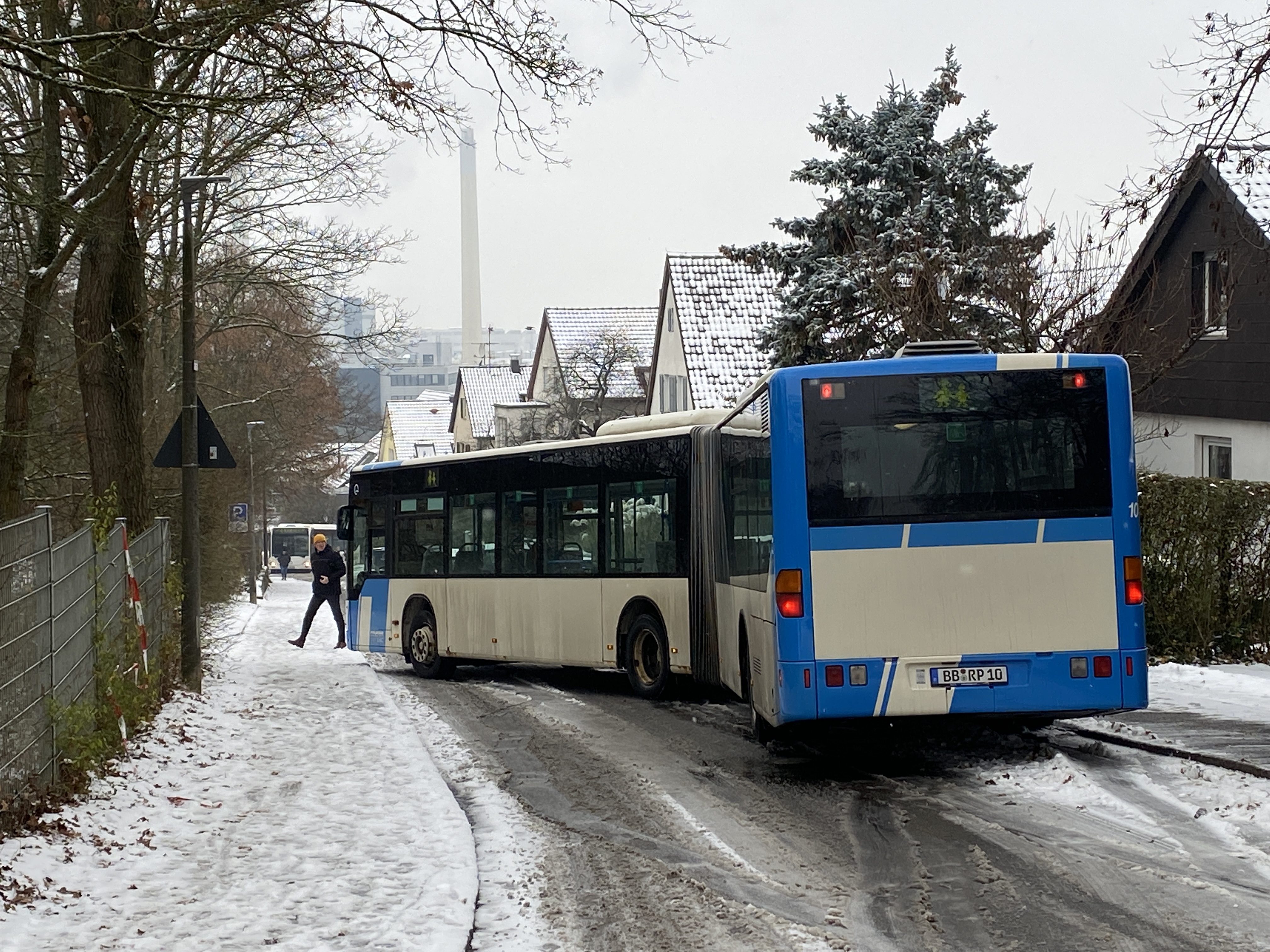 Ersten Erkenntnissen zufolge handelte es sich dabei ausschließlich um Unfälle mit Sachschäden, überwiegend Auffahrunfälle durch ins Rutschen gekommene Fahrzeuge. Dabei krachte es im Landkreis Ludwigsburg 33 Mal, im Landkreis Böblingen wurden 19 Verkehrsunfälle gemeldet. Auch wenn die Winterdienste mit Hochdruck arbeiten, bleibt es vor allem bei anhaltendem Schneefall stellenweise weiterhin gefährlich glatt. So gab es auch auf dem Goldberg in Sindelfingen Probleme mit einem Gelenkbus im Stadtverkehr (Bild: Peter Röhm).