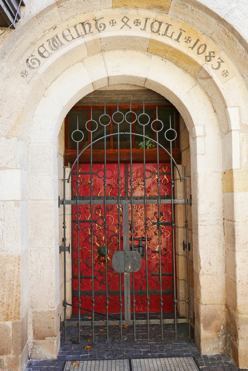 Die blutrote Tür mit ihren gusseisernen und bronzenen Beschlägen ist eines der schönsten Details der Sindelfinger Martinskirche, die 1083 geweiht wurde. Wahrscheinlich war das Gotteshaus damals noch eine Baustelle, denn Untersuchungen der Jahresringe haben ergeben, dass das Holz für den Dachstuhl erst im Jahr 1131 geschlagen wurde. Auffällig am Westportal mit seinen vielen Beschlägen ist der Löwenkopf mit dem eisernen Ring im Maul. Der Löwe steht symbolisch nicht nur für den Evangelisten Markus, sondern vor allem für Christus, dem Löwen von Juda. Der eiserne Ring im Löwenmaul selbst war einst die letzte Rettung für Verfolgte. Es ist der Gnadenring, der Asylring. Demjenigen, der ihn ergriff, garantierte er zumindest Kirchenasyl.