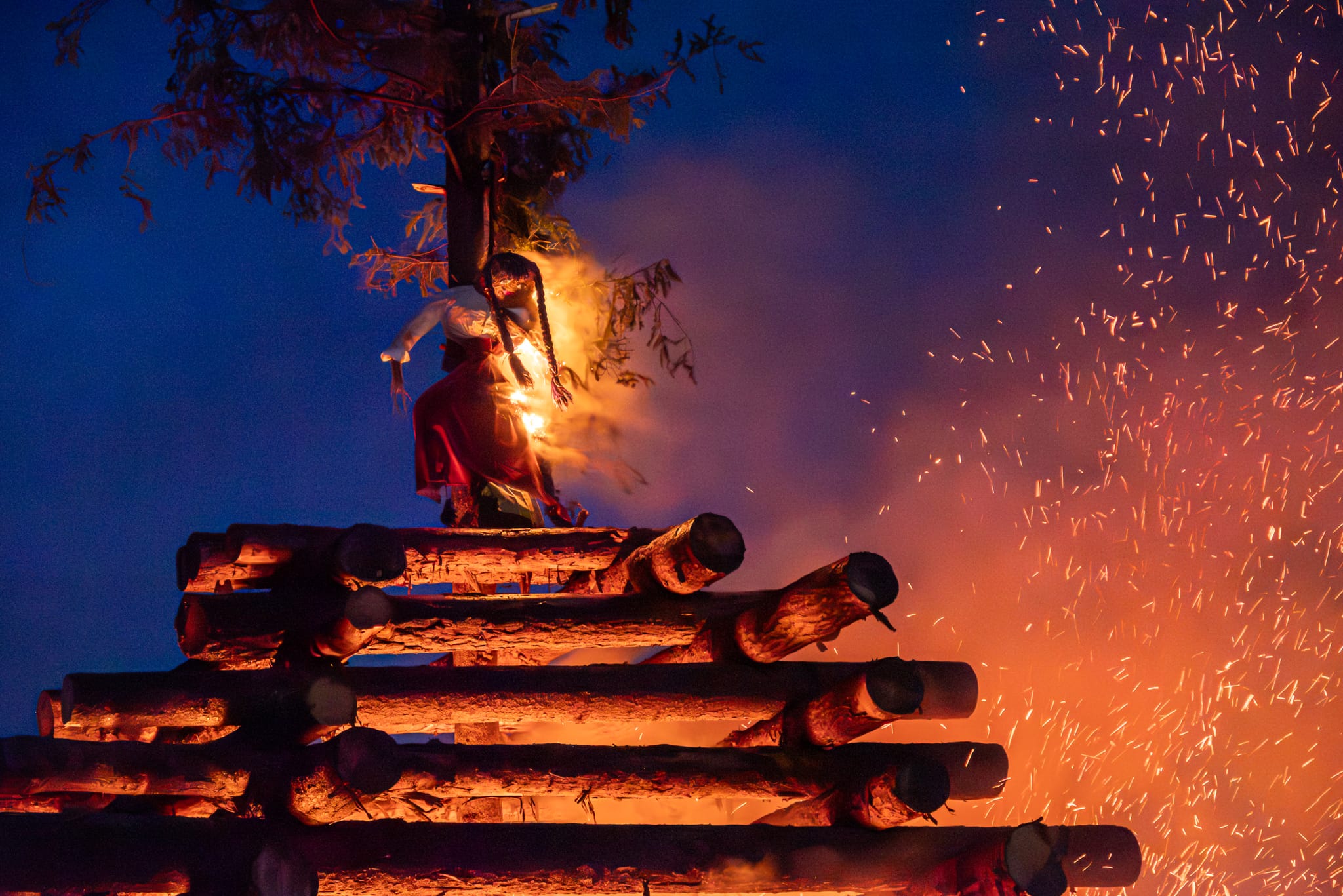 Die Flammen kämpfen mit der Feuchtigkeit, und zunächst ist mehr Rauch als Funken zu sehen. Ein Besucher meint scherzhaft: „Die Hexe stirbt eher an einer Rauchvergiftung als am Feuer.“ Und so war es auch: Sie hielt lange den Flammen und Funken stand, doch irgendwann fingen ihr roter Rock und die lilafarbenen Haare Feuer, und sie wurde ein Raub der Flammen. Weit ist der qualmende und brennende Turm zu sehen, der nach historischer Überlieferung den Winter vertreiben soll. Es knistert und sprüht, während zuerst die Tannenbäume im Inneren verbrennen und erst dann nach und nach auch die zehn Meter langen Holzstämme Feuer fangen.