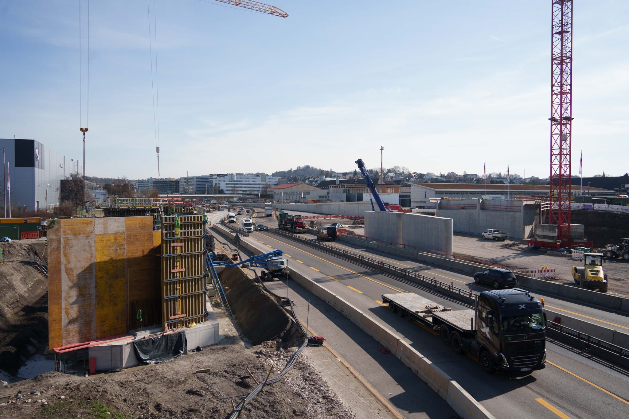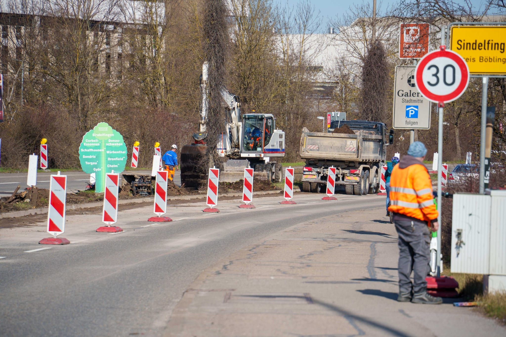 Begonnen wird auf der Ostseite: in der Wolfgang-Brumme-Allee entlang des Bauhofs und in Sindelfingen auf der von Mercedes-Benz abgewandten Seite der Rudolf-Diesel-Straße, wo jetzt die Autofahrer Richtung Sindelfingen unterwegs sind. Das ist die erste Bauphase, die bis Sommer dauern wird. Während der ersten Bauphase wird der gesamte Verkehr auf der Westseite, wo die Motorworld liegt, geführt. Anschließend, voraussichtlich im August, wechseln die Arbeiten auf die andere Seite und der Verkehr rollt auf der Seite des Bauhofs. In dieser Phase in der zweiten Jahreshälfte entsteht dann auch der Lückenschluss zum Flugfeld: Das gut 80 Meter lange Teilstück zwischen Knotenpunkt und Flugfeld-Allee, das hinter dem Sportwagen-Händler vorbeiführt.