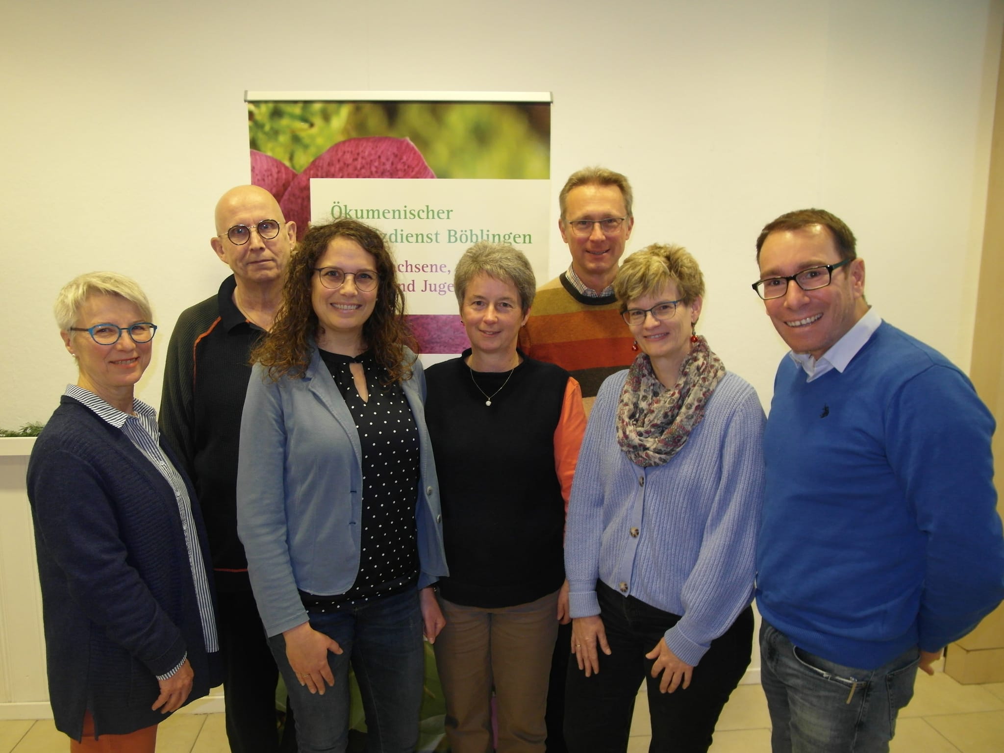 Das Foto zeigt (von links): Andrea Lipowsky-Müller (stellvertretende Vorsitzende der katholischen Gesamtkirchengemeinde Sindelfingen), Martin Offner (Vorsitzender der katholischen Gesamtkirchengemeinde Sindelfingen), Carolin Schlanderer (Fachbereichsleiterin Ökumenischer Hospizdienst beim Evangelischen Diakonieverband im Landkreis Böblingen), Birgit Hospotzky (Koordinatorin Erwachsenenhospizdienst beim Diakonieverband), Klaus Kempter (leitender Pfarrer der katholischen Gesamtkirchengemeinde Böblingen), Myriam Sprenger (Vorsitzende der katholischen Gesamtkirchengemeinde Böblingen), Philipp Koch (Leiter des katholischen Verwaltungszentrums Böblingen/Sindelfingen). Bild: Staber