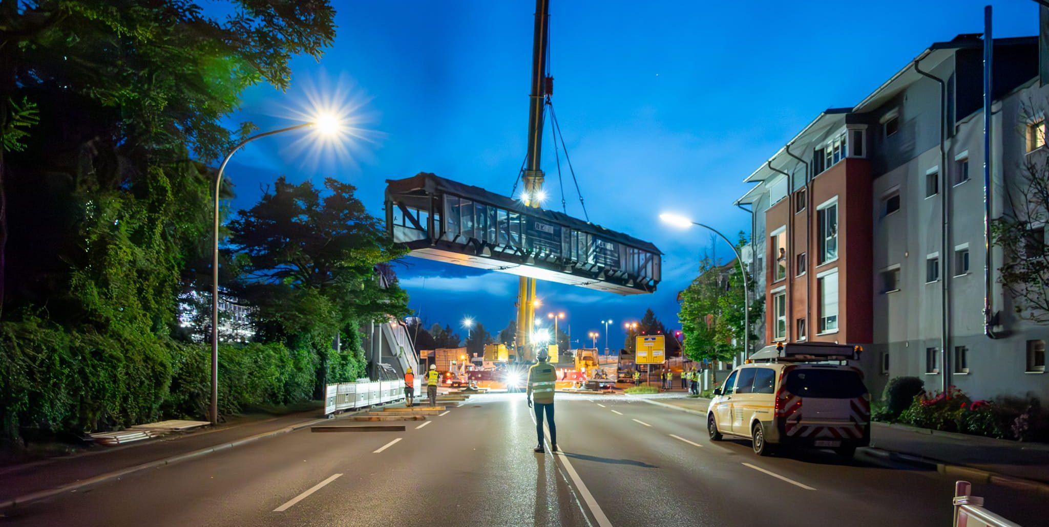 Donnerstagabend: Ein Kran hebt den abgebauten Daimlersteg.