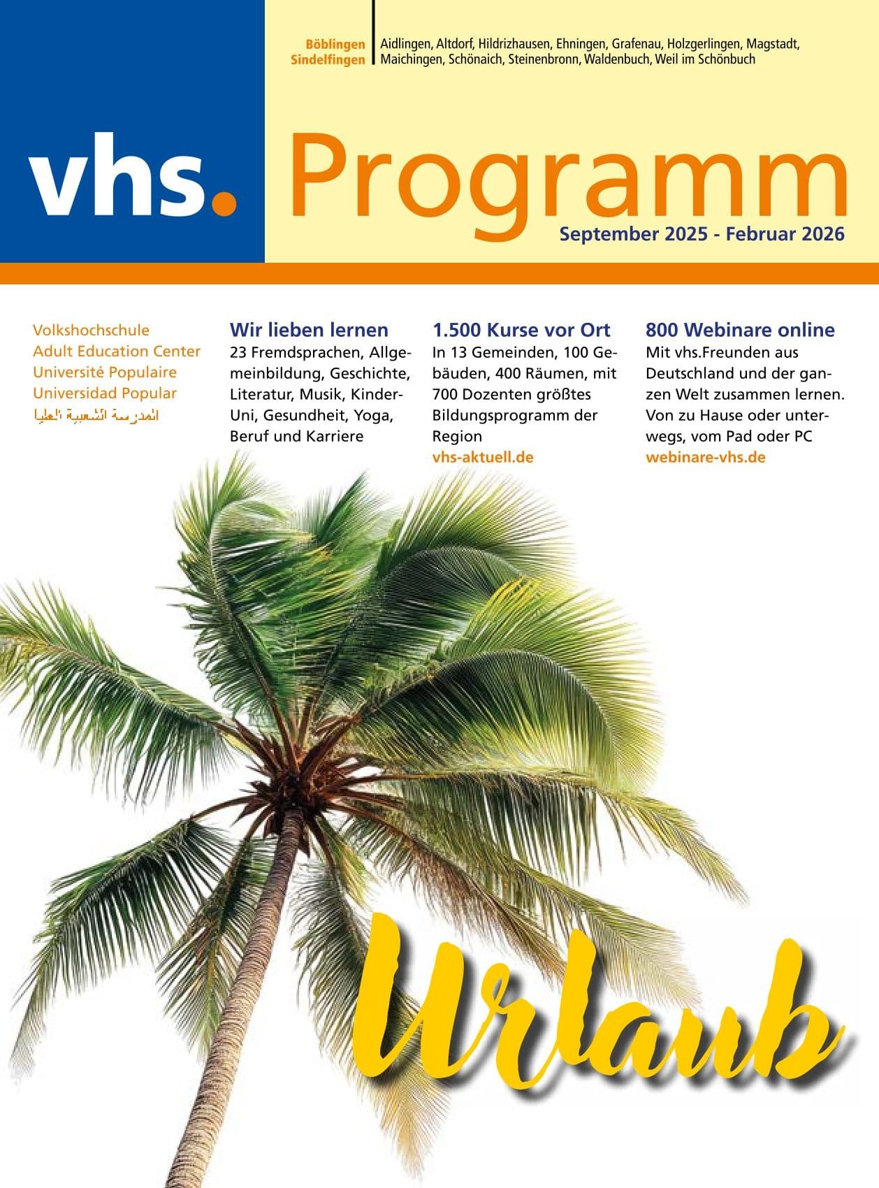 Das neue Programm der VHS Böblingen-Sindelfingen für Herbst und Winter liegt ab dem 12. Juli kostenlos in über 80 Auslagestellen bereit – darunter alle Filialen der Kreissparkasse, der Volks- und Raiffeisenbanken, Marktkauf, Buchhandlungen, Rathäuser, die Mercaden Böblingen und das Breuningerland Sindelfingen. Online sind sämtliche 1500 Präsenzkurse sowie rund 800 Webinare buchbar auf www.vhs-aktuell.de.