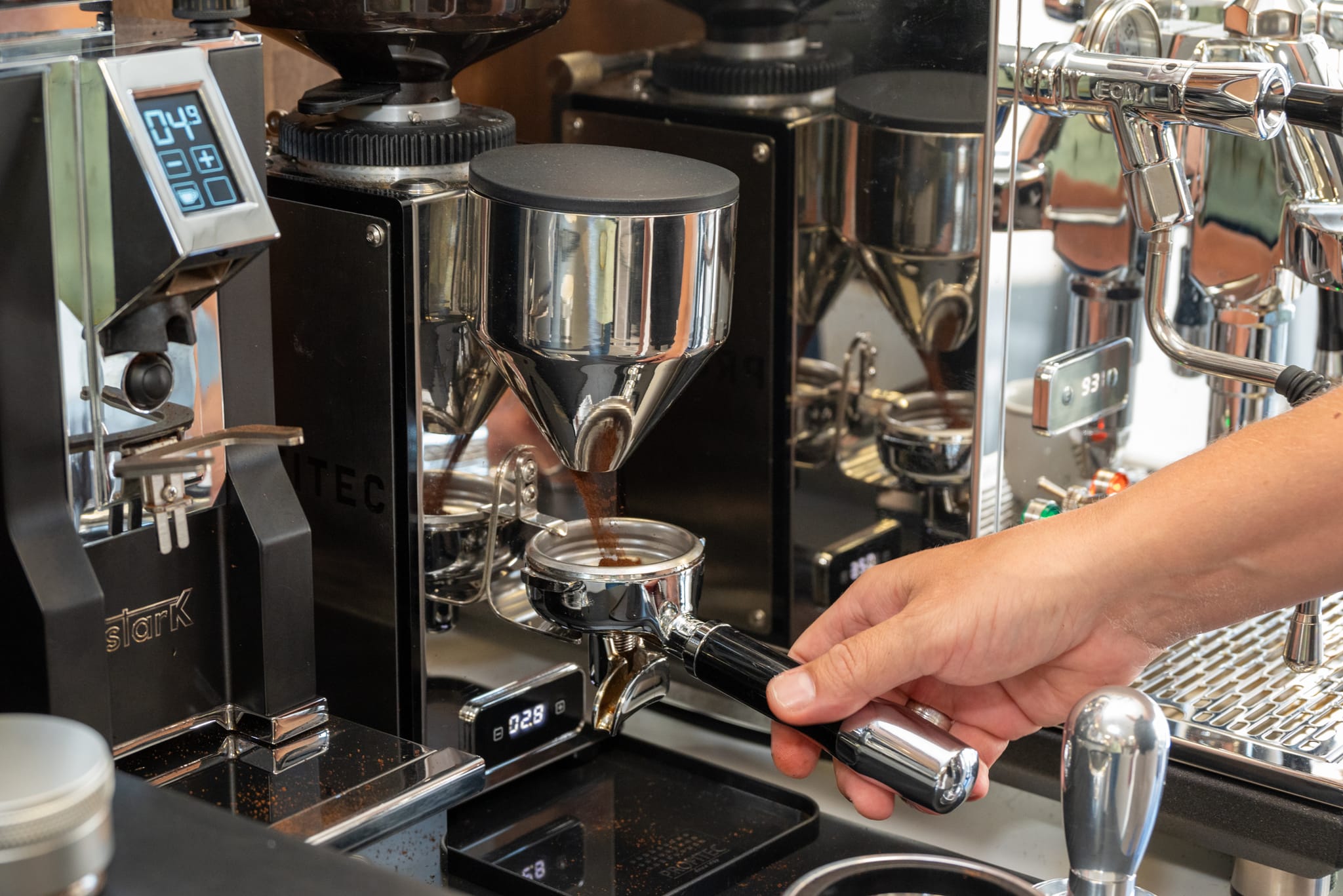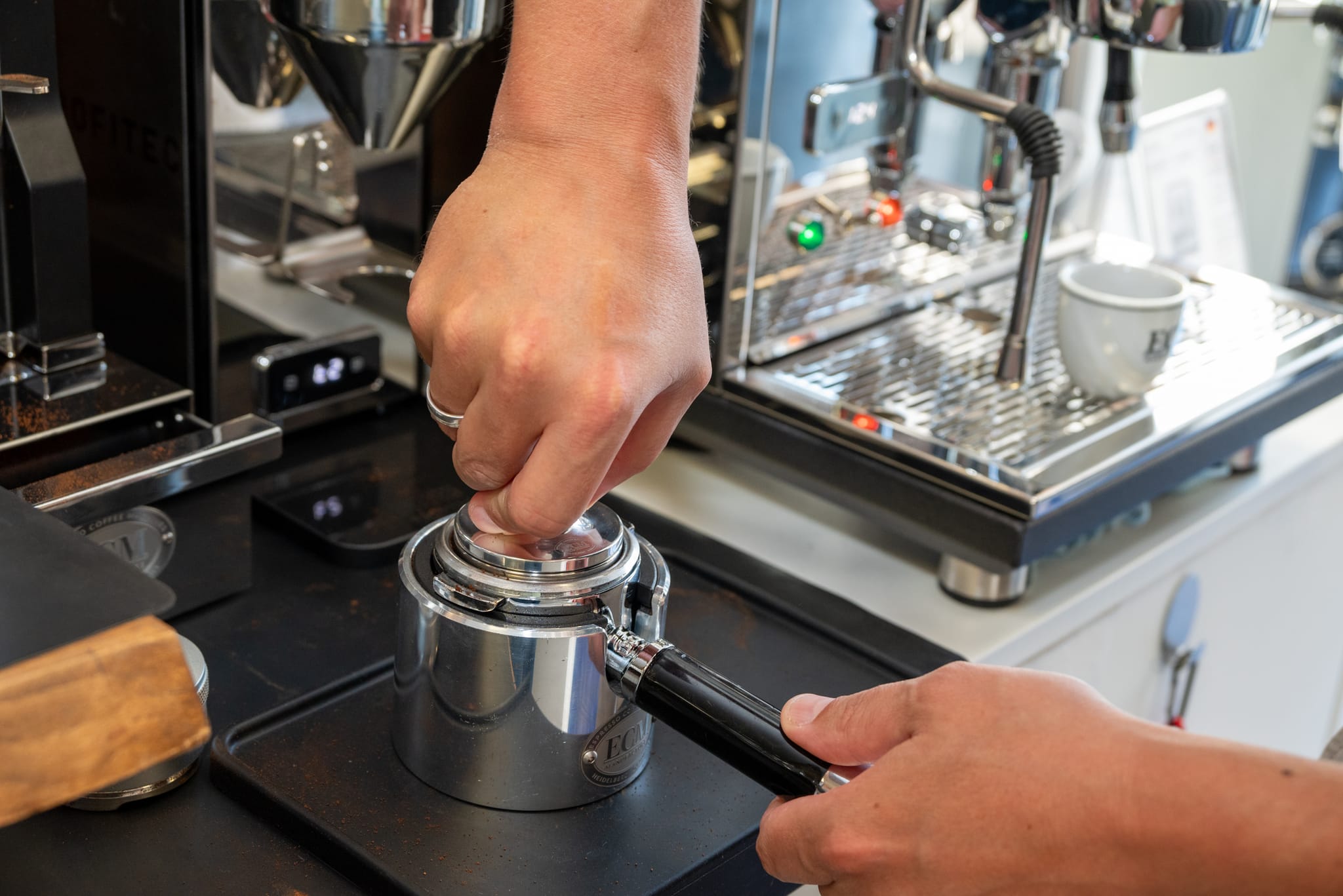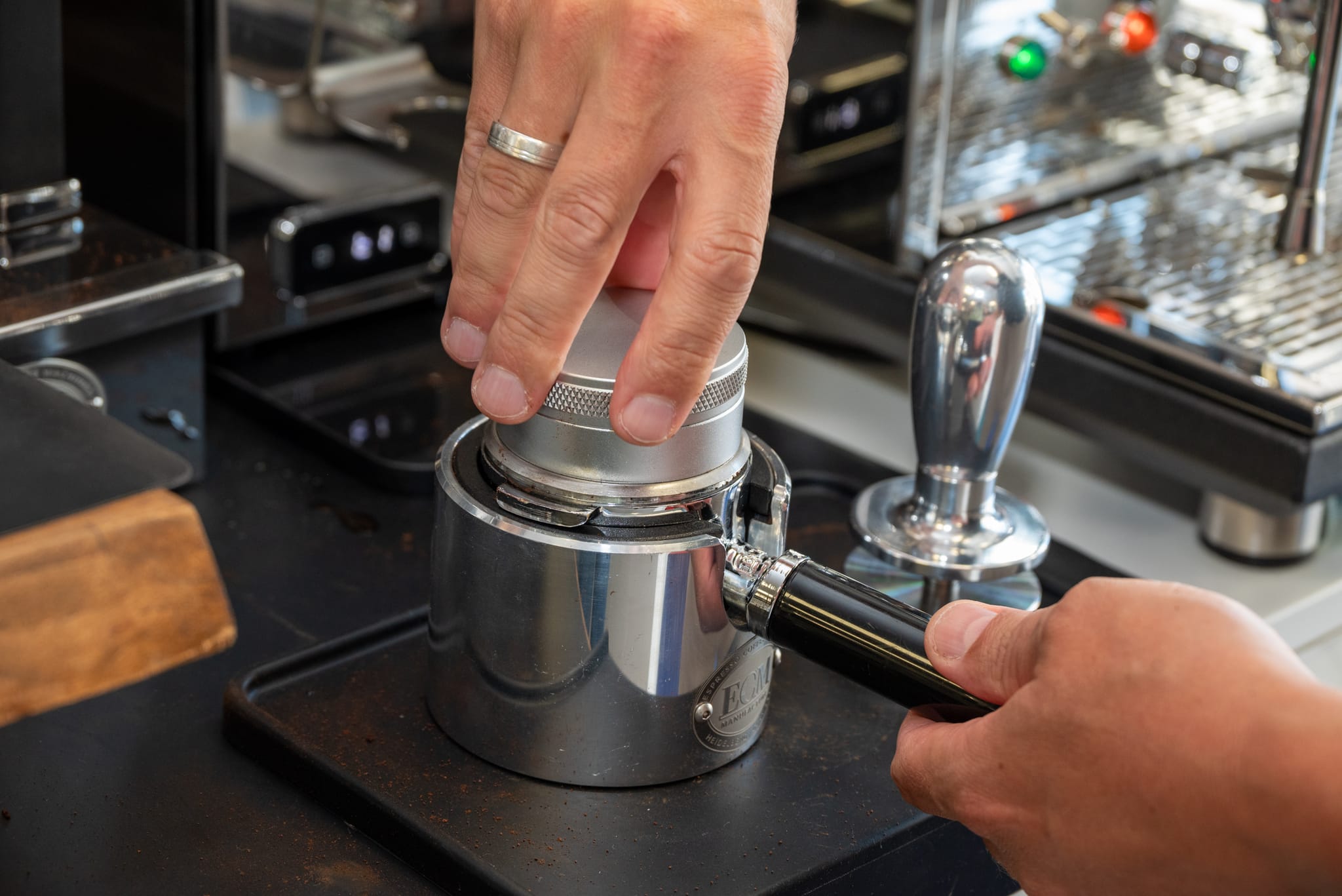 Tamper: sorgt für eine gleichmäßige Verdichtung des Kaffeemehls.