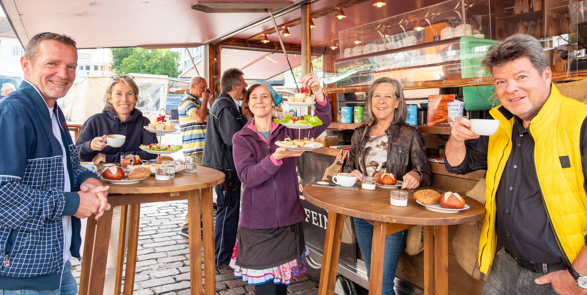 Zu den ersten Gästen zählen auch Sabine Single und Volker Jaksch aus Maichingen. „Wir gehen regelmäßig auf dem Markt einkaufen und lieben das Angebot und insbesondere den Kaffee. Dieses Angebot ist mal etwas anderes als im Café zu frühstücken“, sagen die beiden. Man kommt ganz ungezwungen mit anderen ins Gespräch, finden auch Dieter und Heike Seyboth, die am Nebentisch genussvoll in den Tag starten.