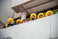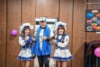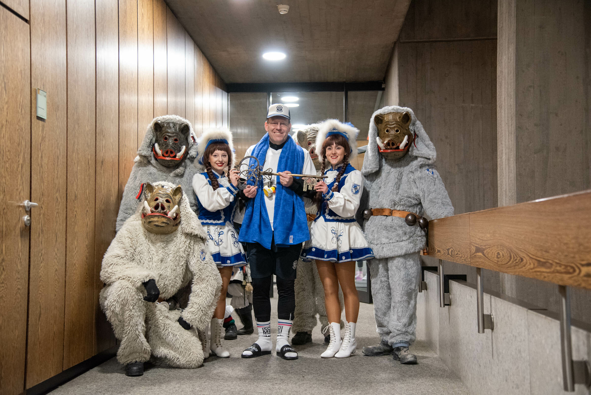 Ganz im Gegenteil, unterstützt von den vielen Kindern rief Uschi Zinser „Schlüssel raus, Schlüssel raus.“ Als die Brunnensäue und Gardemädchen dann den Balkon stürmten, war es mit dem Widerstand vorbei, „Oberbademeister“ Vöhringer schwenkte die weiße Fahne und der Schlüssel und die Rathausmacht ging auf die Narren über.