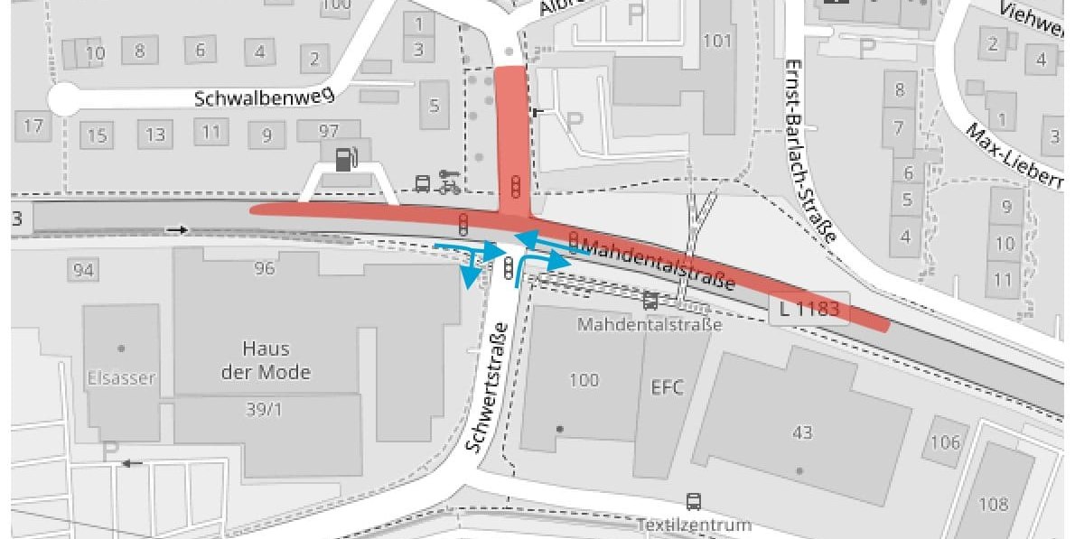 Unverändert gilt, dass das Linksabbiegen aus Richtung Autobahn (Osten) kommend in die Schwertstraße nicht möglich ist, sowie weiterhin der Linksabbiegevorgang von der Schwertstraße in die Mahdentalstraße in Richtung Innenstadt.