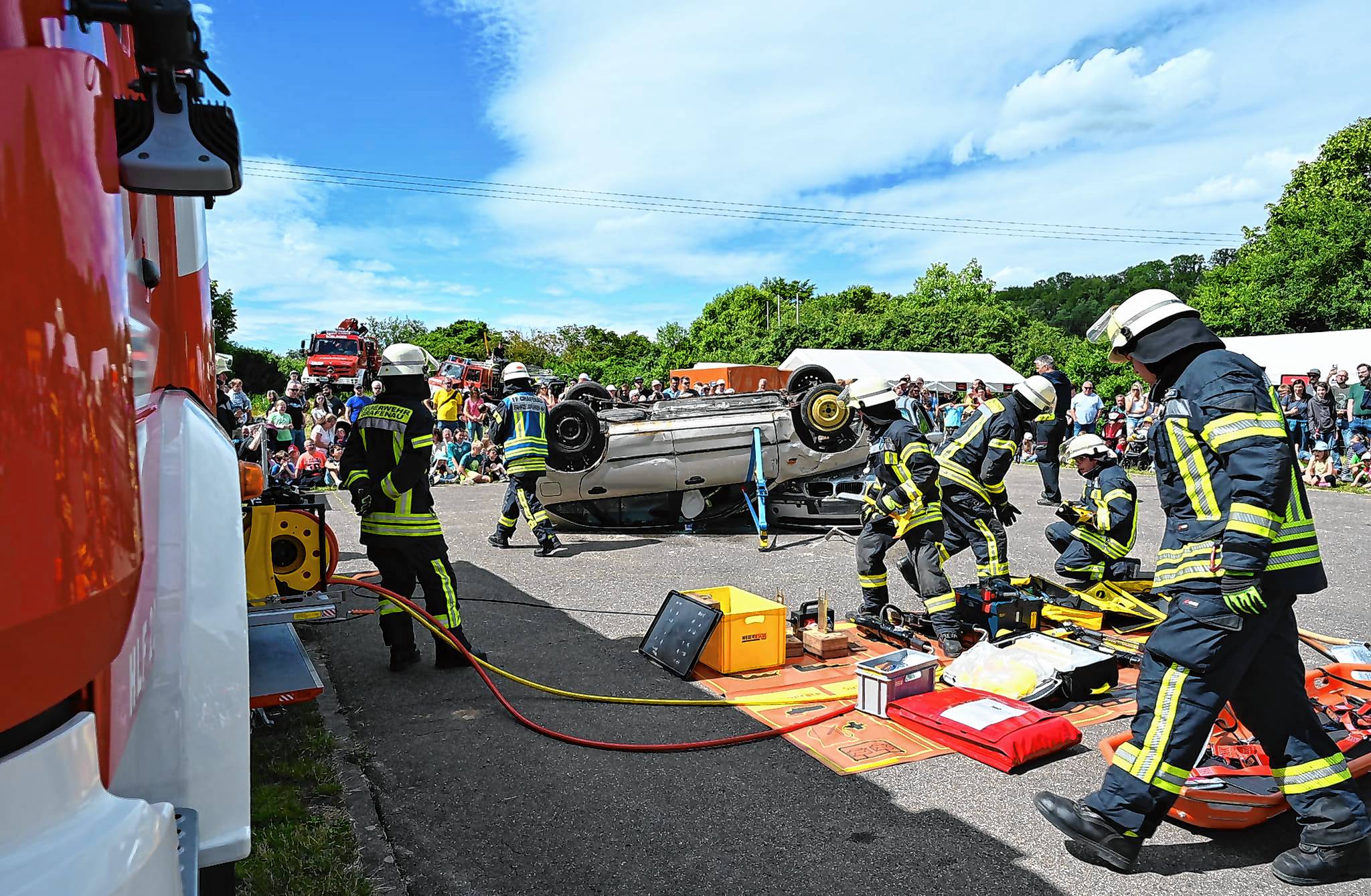Der Einsatz vor Publikum mit dem Aufbrechen der Fahrzeuge bis zur Rettung der Verletzten dauerte eine knappe halbe Stunde, um beim Vorgehen die einzelnen Schritte anschaulich zu machen. Bei einem echten Unfall ginge das wesentlich schneller. Wie schnell, das ließe sich aber nicht sagen. Gerd Nädele: „Denn die Situation ist jedes Mal anders.“ So wolle die Feuerwehr den Verunglückten möglichst Erschütterungen ersparen, denn diese verstärken bei Verletzungen häufig die Schmerzen. Wenn aber ein Unfallwagen anfange zu brennen, gebe es nur noch eine Lösung: „Eine Crashrettung. Die Verletzten so schnell wie möglich rausholen.“