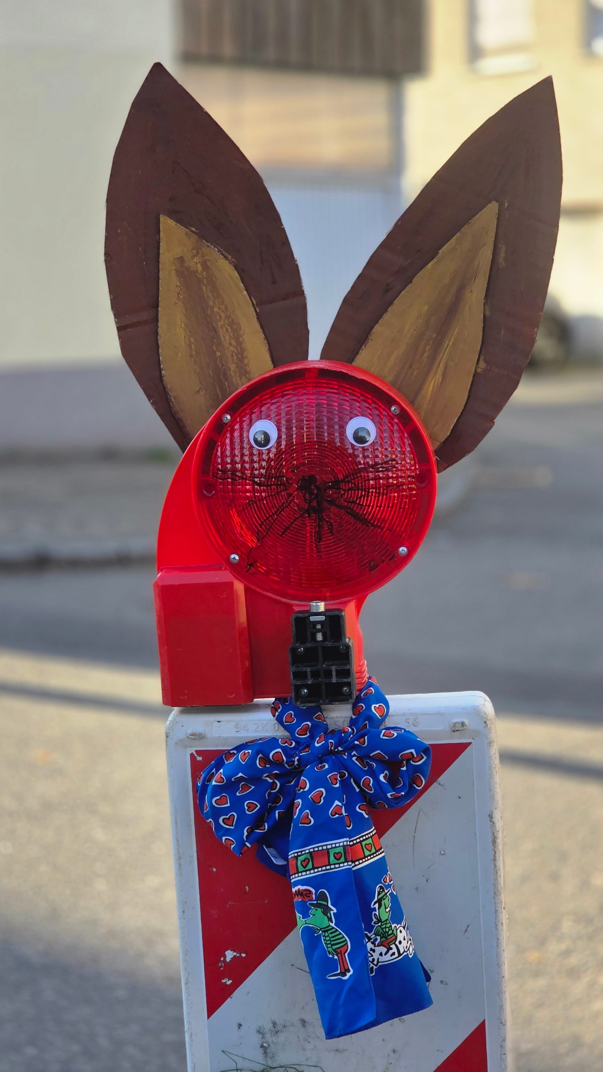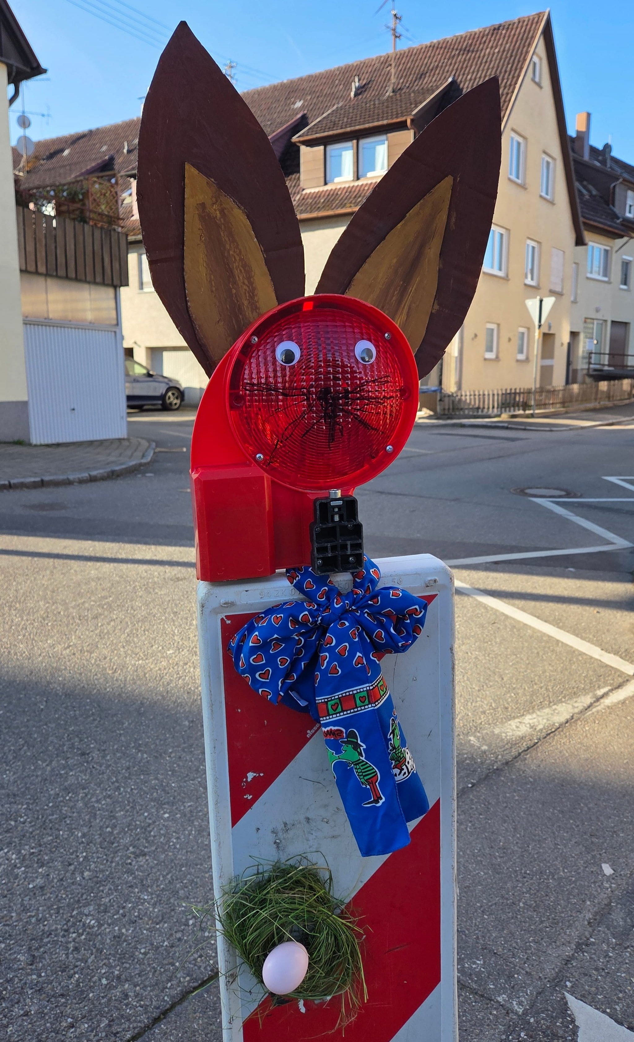 Mit aufgesetzten Ohren, aufgeklebten Augen und einer blauen Schleife wird aus der Warnleuchte ein Gesicht. Auch an Details wurde gedacht: Unterhalb der Bake hängt ein kleines Nest mit Ei, das die kreative Gestaltung abrundet. Die Dekoration wirkt liebevoll gemacht und hebt sich deutlich von der sonst eher nüchternen Baustellenumgebung ab.