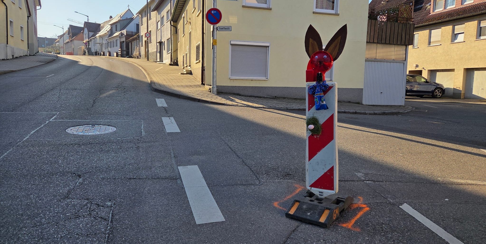 Magstadt. An der Alten Stuttgarter Straße, Ecke Goethestraße, sorgt derzeit ein ungewöhnlicher Hingucker für Schmunzeln: Eine Warnbake wurde kurzerhand zum Osterhasen umgestaltet.