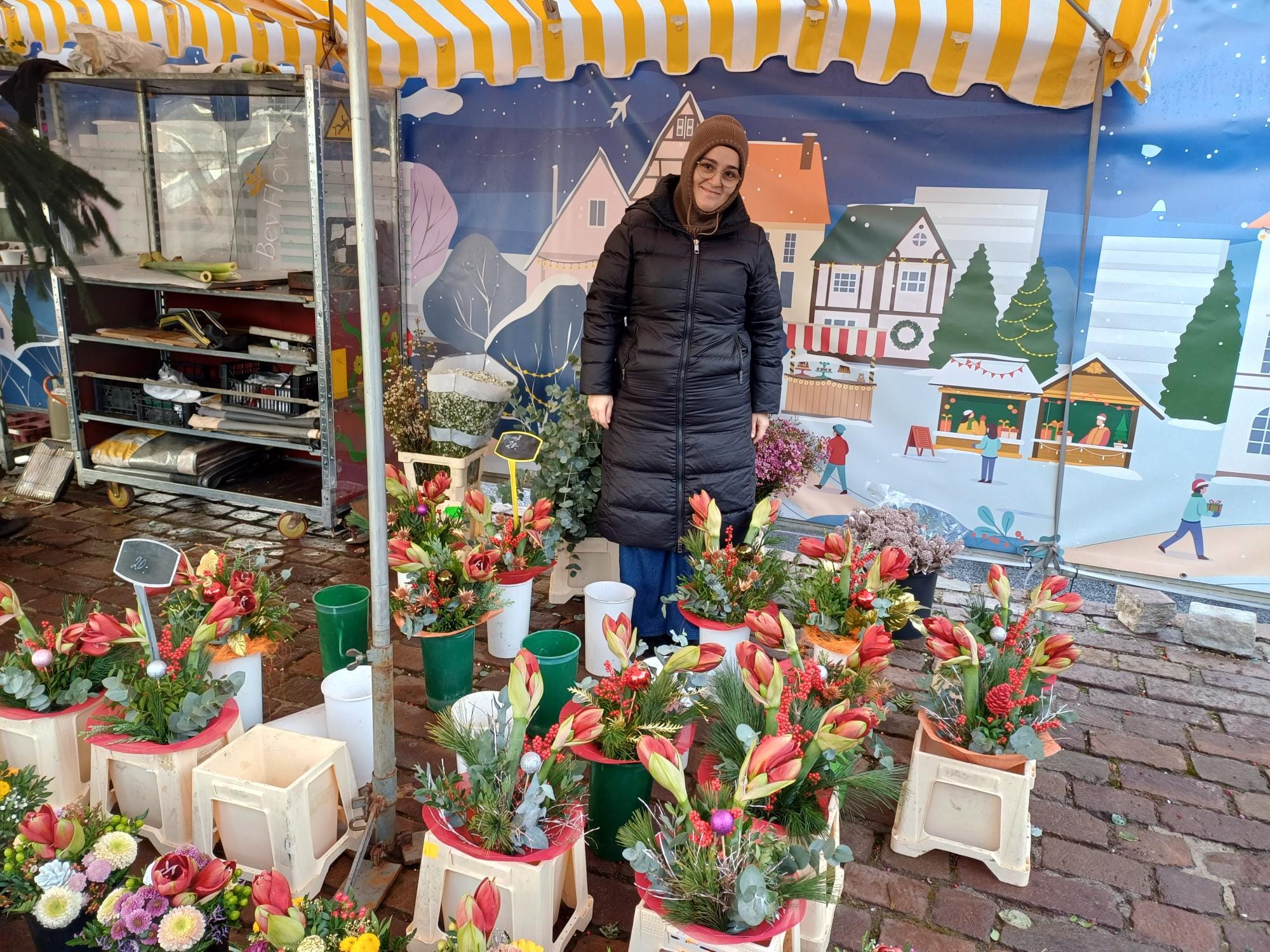 Sindelfingen. Tannengestecke mit Wachsrosen, Weihnachtssterne, besondere Sträuße, Mistelzweige: Auf dem Sindelfinger Wochenmarkt geht es am Samstag am Stand von Tugba Karakelle von „Bey Flowers Karlsruhe“ ...
