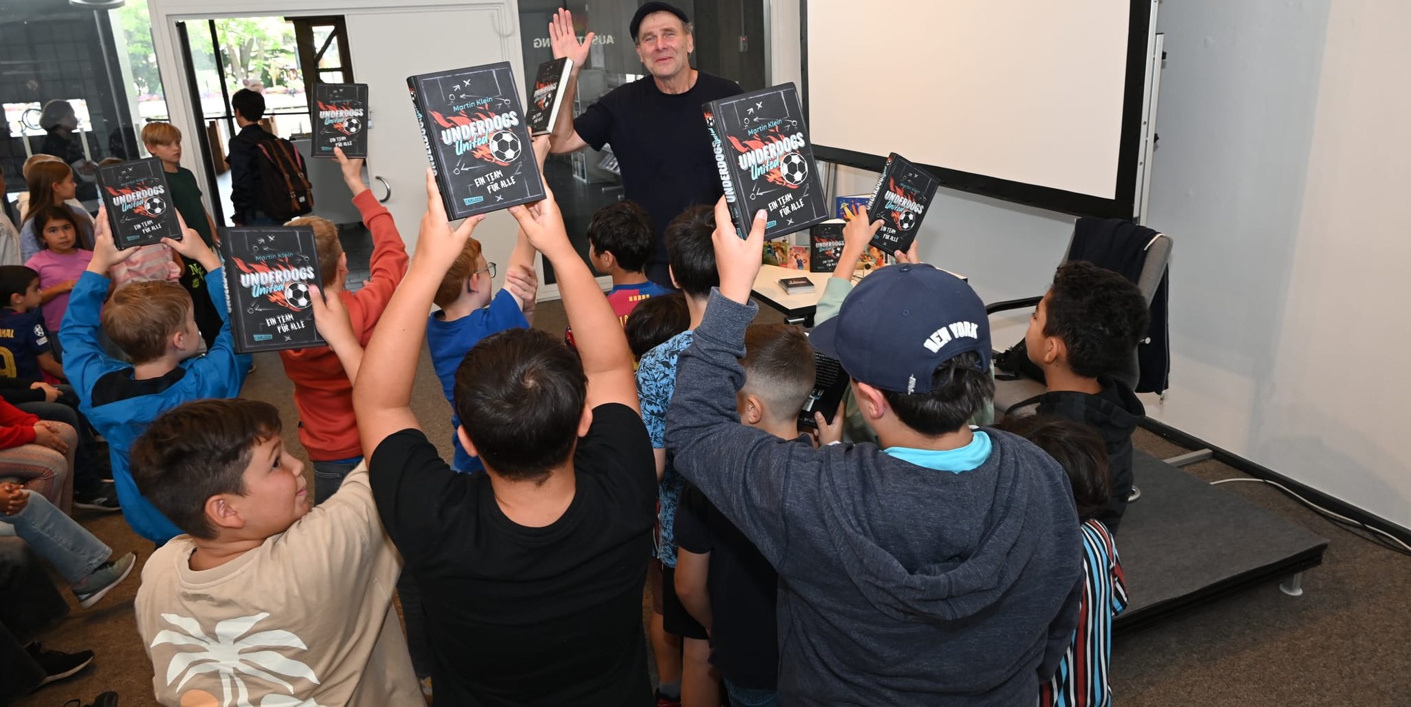 Autor Martin Klein nimmt Grundschüler bei einer Lesung gedanklich mit auf den Fußballplatz.