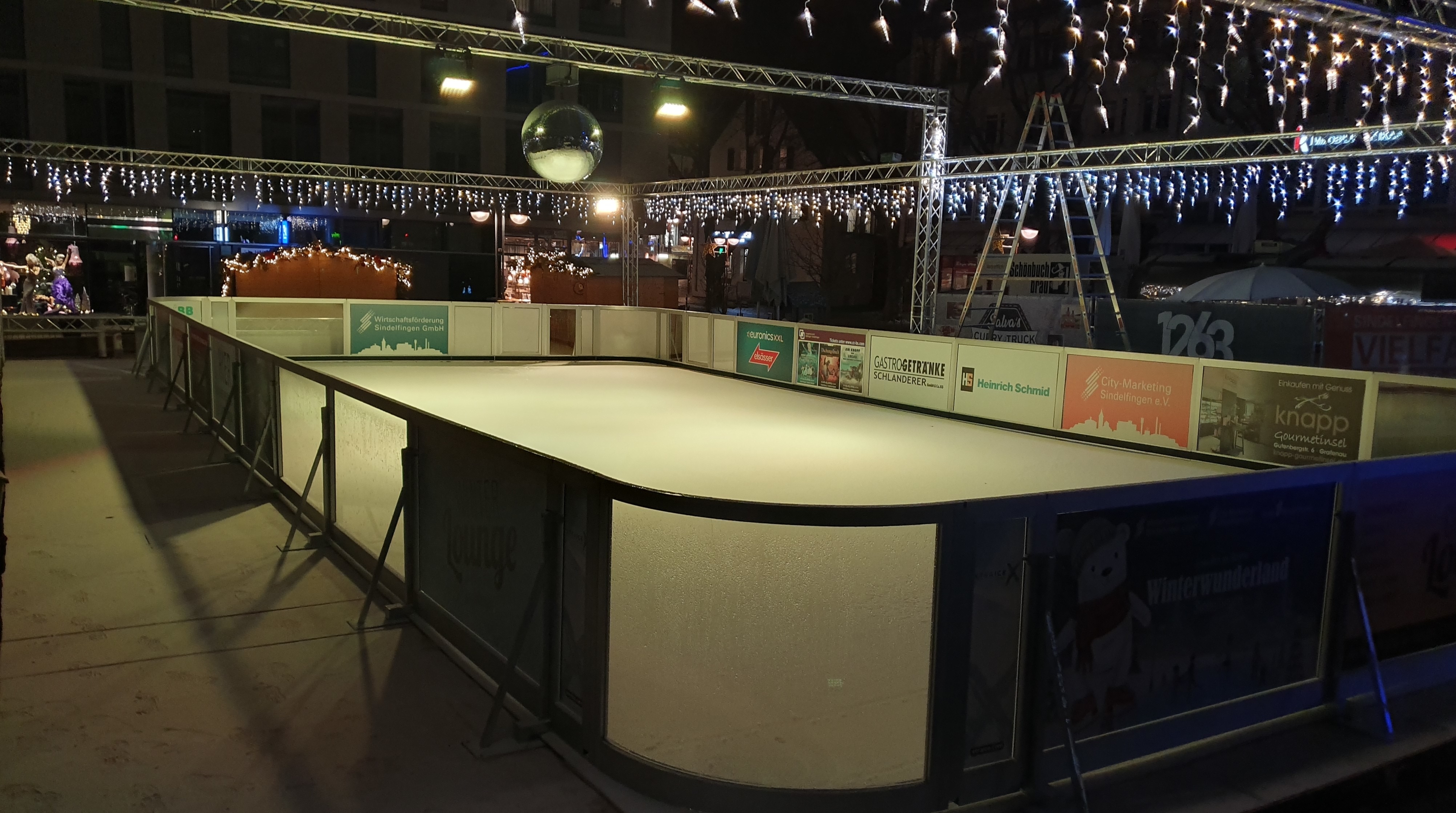 Die Eisbahn ist aufgebaut, Strahler und Diskokugel hängen, die Banden stehen. Eigentlich könnte es los gehen. Und das passiert auch bald. Am Donnerstag um 15 Uhr beginnt die Schlitterpartie auf der 20 Mal 10 Meter großen Eisbahn. Die Schlittschuhe kann man sich vor Ort ausleihen oder selbst mitbringen. Das Projekt ist eine Kooperation der Stadtverwaltung Sindelfingen, der Wirtschaftsförderung Sindelfingen GmbH und des City-Marketing Sindelfingen. Geöffnet ist die Eisbahn bis Mitte Januar von Montag bis Freitag von 14 bis 22 Uhr. Samstag und Sonntag kann man von 10 bis 22 Uhr Schlittschuhlaufen.