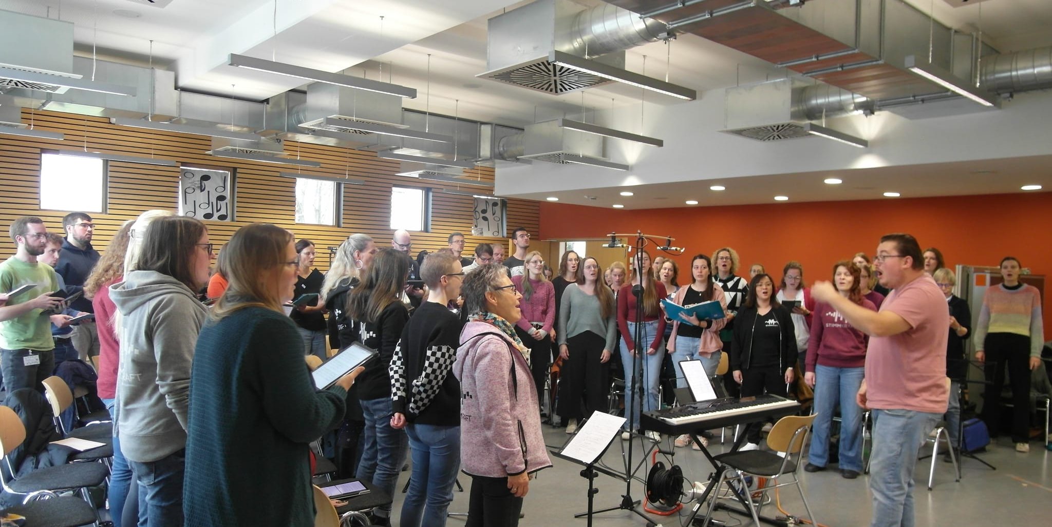 Chorleiter Jonas Kronmüller bei den Proben mit den Stimmen von „Stimmkraft“.
