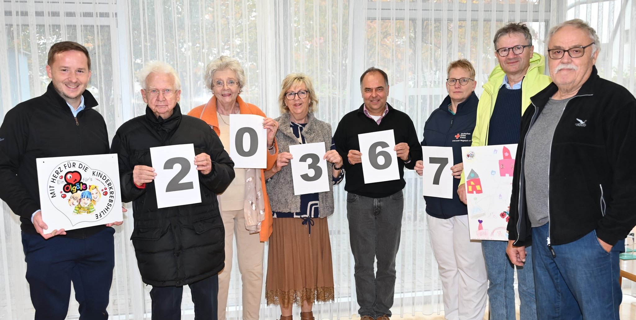 Die Ziffern zeigen die Höhe der Rekordspende an. Bei der symbolischen Geldübergabe dabei waren (von links): Magstadts Bürgermeister Florian Glock, das Maichnger Ehepaar Peter und Ulrike Heimann, Hilla Müller (alle von „Ein Herz fürs Olgäle“), Magstadts Hauptamtsleiter Hans-Peter Burckhardt, Yvonne Janssen (stellvertretende Sozialleiterin des DRK Magstadt), Spender Leo Birg, für den krebskranke Kinder ein Bild gebastelt und gemalt haben, und Peter Müller („Ein Herz fürs Olgäle“).