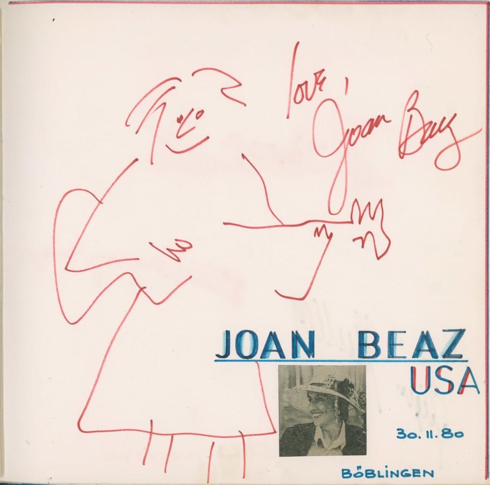 Joan Baez hat sich 1980 mit einer Zeichnung im Autogramm-Album von Andreas Henkel verewigt.