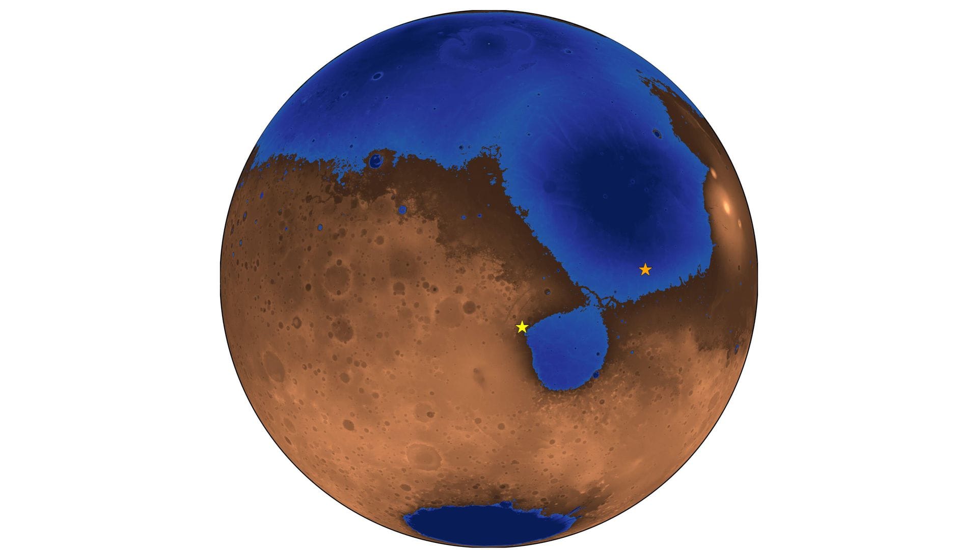 Ein hypothetisches Bild des Mars vor 3,6 Milliarden Jahren, als ein Ozean fast die Hälfte des Planeten bedeckt haben könnte. Die blauen Bereiche zeigen die Tiefe des Ozeans, der bis zum Niveau der Küstenlinie des alten, heute verschwundenen Meeres, genannt Deuteronilus, gefüllt war. Der orangefarbene Stern stellt die Landestelle des chinesischen Rovers Zhurong dar. Der gelbe Stern ist die Landestelle des NASA-Rovers Perseverance, der einige Monate vor Zhurong gelandet ist.